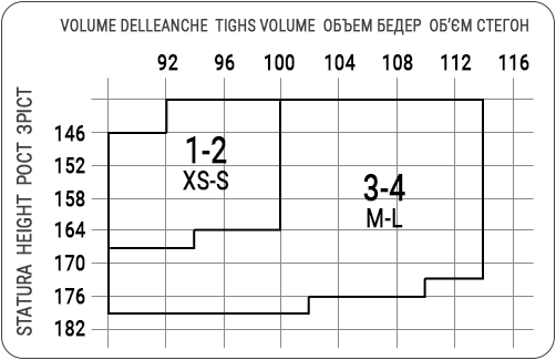 | Напівобхват бедeр | 53 | 54.5 | 56.5 | 59 | 59 | 62 | 65 | 66 | |